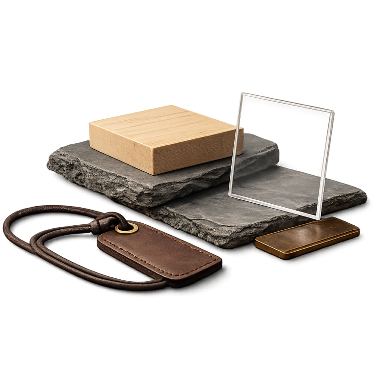 Neben Holz, Schiefer und Metall arbeite ich auch mit Leder, Glas und Acryl – immer passend zum jeweiligen Stück und seiner Geschichte.